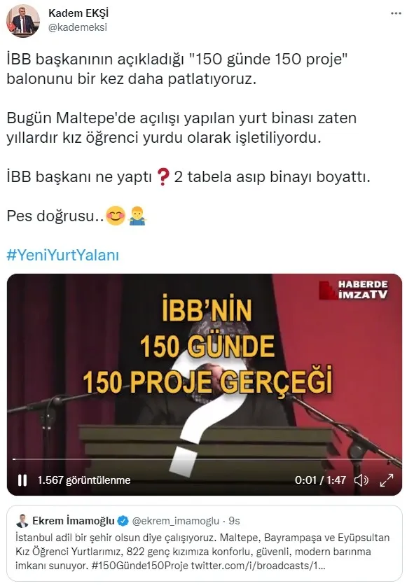 İstanbul Büyükşehir Belediyesi (İBB) Meclisi Deprem ve Doğal Afetler Komisyonu Başkanı Kadem Ekşi, "İBB başkanının açıkladığı '150 günde 150 proje' balonunu bir kez daha patlatıyoruz. Bugün Maltepe'de açılışı yapılan yurt binası zaten yıllardır kız öğrenci yurdu olarak işletiliyordu. İBB Başkanı ne yaptı? 2 tabela asıp binayı boyattı. Pes doğrusu" ifadelerini kullandı.